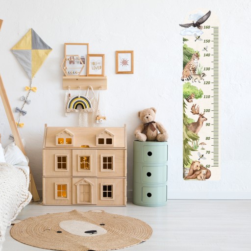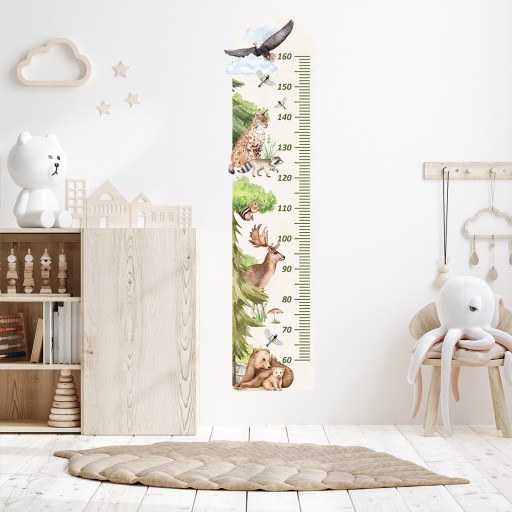 Nasza miarka wzrostu do naklejenia na ścianę z motywem leśnych zwierząt nie tylko pięknie ozdobi pokój dziecka, ale pozwoli również sprawdzać jak szybko rośnie nasza pociecha.