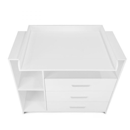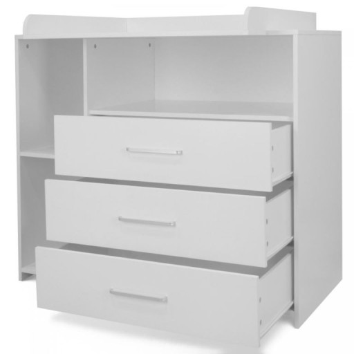Przewijak z dużą ilością miejsca do przechowywania w trzech szufladach i trzema otwartymi półkami to idealny dodatek do pokoju dziecięcego Przepakowywanie na dużej powierzchni do przewijania i pieluch, ubrań, produktów do pielęgnacji niemowląt i innych rzeczy w zasięgu ręki zapewnią komfort Tobie i Twojemu dziecku Biały kolor mebli dziecięcych z łatwością wpasuje się w różne style wnętrz Gdy Twoje dziecko dorośnie, możesz łatwo i trwale usunąć przewijak z tego wielofunkcyjnego mebla Dzięki temu komoda może być nadal używana i rosnąć wraz z rozwojem Twojego ulubionego.