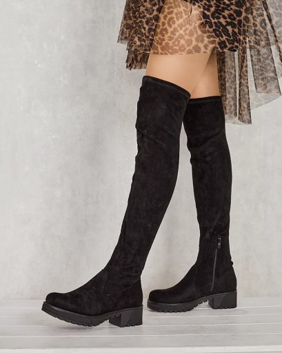 Długie damskie kozaki na grubszej podeszwie, cholewka wykonana z eko-zamszu. Buty są zapinane na suwak na wysokości kostki. Idealna baza dla wielu letnich outfitów!