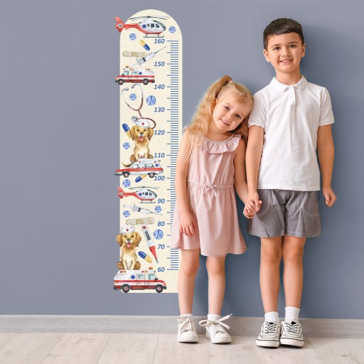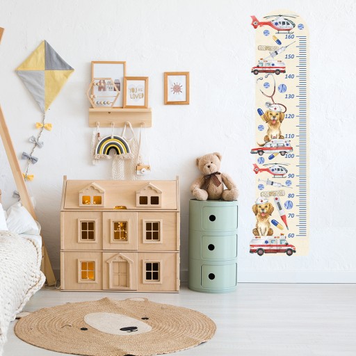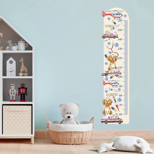 Nasza miarka wzrostu do naklejenia na ścianę z karetkami pogotowia nie tylko pięknie ozdobi pokój dziecka, ale pozwoli również sprawdzać jak szybko rośnie nasza pociecha.