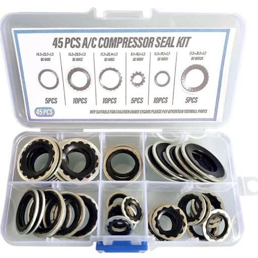 【Praktyczne opakowanie】Otrzymasz zestaw 45-częściowych tarczy uszczelniających sprężarki klimatyzacyjnej. Uszczelki są starannie uporządkowane w przezroczystym plastikowym pudełku z przedziałami, co ułatwia szybkie znalezienie odpowiedniego rozmiaru. Oszczędza to cenne i eliminuje wszelkie kłopoty podczas instalacji.