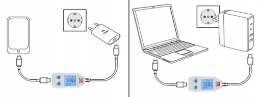 Oferowany miernik to wielofunkcyjne urządzenie do monitorowania portu USB typu C podczas ładowania podłączonego smartfona, tabletu itp. Miernik mierzy napięcie i prąd ładowania, napięcie szyny danych, pobraną energię, czas ładowania oraz rezystancję zastępczą podłączonego urządzenia. Miernik podłączany jest szeregowo do źródła zasilania - kabel miernika podłączamy do zasilacza/ładowarki zaś smartfon/tablet/laptop podłączamy kablem USB/C do gniazda miernika: