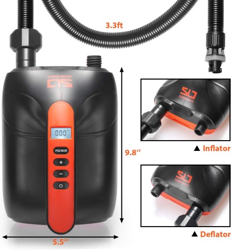 Ta jednostopniowa inteligentna pompa elektryczna 12V DC jest wyposażona w sterowanie cyfrowe i ekran LCD do wyświetlania ustawionego ciśnienia i ciśnienia powietrza w czasie rzeczywistym. Pompa może automatycznie zatrzymać pompowanie przy ustawionym wcześniej ciśnieniu powietrza. Wyposażona w 6 dysz, które pasują do większości materacy powietrznych, pontonów, namiotu, desek wiosłowych itp.