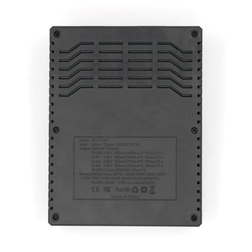 Wysoka kompatybilność: kompatybilny z akumulatorami Li-ion (4,2 V/4,35 V) 9 V (6F22) LiFePO4 (3,6 V), Ni-MH/Ni-Cd (1,48 V) 9 V (6F22). oraz wszelkiego rodzaju cylindryczne baterie litowe wielokrotnego ładowania.
