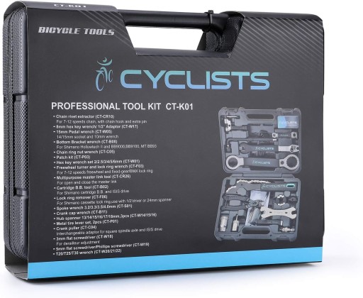 - 23-częściowy zestaw narzędzi rowerowych – ten zestaw naprawczy do roweru składa się z 23 narzędzi, w tym do usuwania nitów łańcuchowych, kluczy do pedałów, ściągacza łańcuchowego i wielu innych popularnych narzędzi, które mogą zaspokoić zwykłe potrzeby naprawy i konserwacji. Nadaje się do rowerów sportowych, takich jak rowery wyścigowe i górskie.