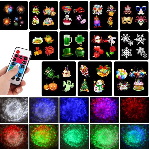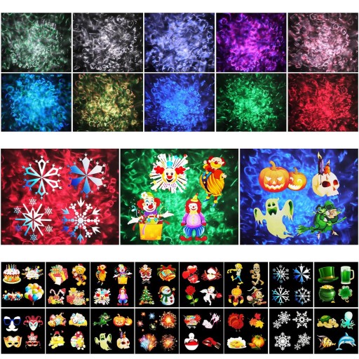 - Ta lampa projekcyjna LED jest wyposażona w dwie soczewki projekcyjne, 12 slajdów 10 wzorów projekcyjnych z efektem fali wodnej.