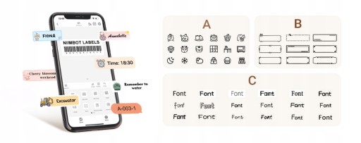 A: W aplikacji znajdziesz setki czcionek, dowolnie ustawisz rozmiar tekstu, kodów EAN, zdjęć i innych danych- dowolność w projekcie naklejki jest nieograniczona, możesz dodać wiele elementów na jednej naklejce - pamiętaj jednak, że jest niewielkich rozmiarów. Aplikacja NIIMBOT obsługuje polskie znaki - bez problemu wydrukujesz podziękowania pięćdziesięciopięcioipółlatkąście :-)