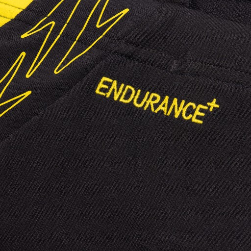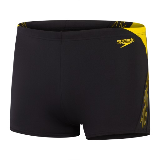 W tych czarnych bokserkach kąpielowych Hyper Boom Spliced pobrzmiewa echo archiwalnych projektów Speedo. Zawierają kultowy, w odświeżonej formie, pasek z logo boom w jaskrawym żółtym kolorze. Stylowe, o opływowym kształcie aquashorty posiadają sznurek w pasie dla właściwego dopasowania. Wykonane z wytrzymałej tkaniny Endurance+, która jest szybkoschnąca i w pełni odporna na działanie chloru. Jedna z nici w tej tkaninie pochodzi w 100% z odpadów pokonsumenckich.