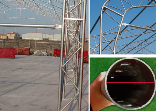 Zaletą hali namiotowej jest jej szczególnie mocna konstrukcja oparta na stalowych kratowych rurach. Podobne konstrukcje kratowe znajdują zastosowanie w szkieletach budynków i budowli o dużych rozmiarach.