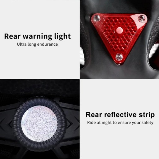 Kask rowerowy ze zdejmowanym tylnym światłem. W zestawie kaski rowerowe dla mężczyzn i kobiet podświetlenie ledowe w kształcie diamentu. 3 tryby oświetlenia (stały, wolno migający i szybki migający) pomaga ludziom jadącym za Tobą wyraźnie rozpoznać Twój kierunek oraz zapewnia maksymalną widoczność i bezpieczeństwo podczas nocnej jazdy po miejskich ulicach i poza miastem. W zestawie znajduje się również 2 baterie.