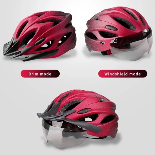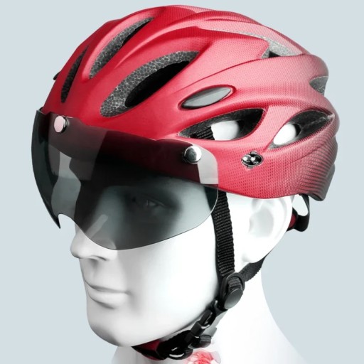 Bardzo lekki kask rowerowy z szybą, okularami i daszkiem.