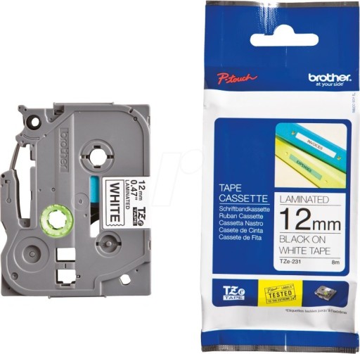 Taśma do nadruku Brother TZe TZe-231 Kolor taśmy: biały Kolor nadruku:czarny 12 mm 8 m