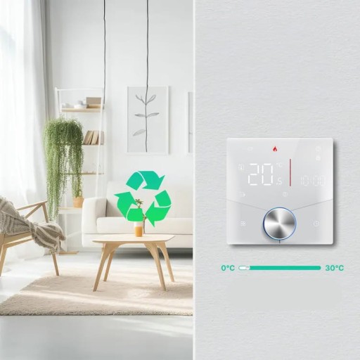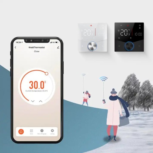 Urządzenie o wymiarach 88x88 mm, które służy do sterowania temperaturą w pomieszczeniu np. pieców gazowych, węglowych czy bojlerów. Termostat posiada wbudowany czujnik temperatury, a sterowany jest poprzez aplikację mobilną Tuya, panelem dotykowym oraz asystentami głosowymi Amazon Alexa i Google Assistant. Dostępne są trzy tryby pracy: ręczny, ECO i automatyczny. Aplikacja umożliwia zaprogramowanie 6 cykli dziennie dla każdego dnia w tygodniu. Termostat umożliwia na przykład wyłączenie ogrzewania przed podróżą, a nagrzewanie parę godzin przed powrotem.