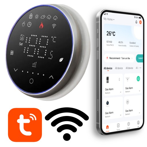 Urządzenie o średnicy 80mm, które służy do sterowania temperaturą w pomieszczeniu np. pieców gazowych, węglowych czy bojlerów. Termostat posiada wbudowany czujnik temperatury, a sterowany jest poprzez aplikację mobilną Tuya oraz asystentami głosowymi Amazon Alexa i Google Assistant. Dostępne są dwa tryby pracy: ręczny i automatyczny. Aplikacja umożliwia zaprogramowanie 6 cykli dziennie dla każdego dnia w tygodniu. Termostat umożliwia na przykład wyłączenie ogrzewania przed podróżą, a nagrzewanie parę godzin przed powrotem.