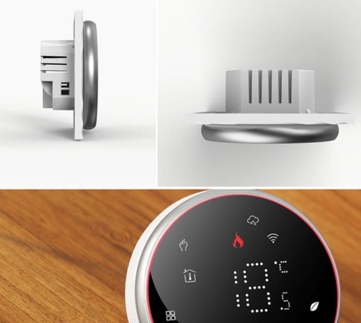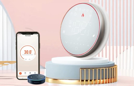 Urządzenie o średnicy 80mm, które służy do sterowania temperaturą w pomieszczeniu np. ogrzewania podłogowego. Termostat posiada wbudowany czujnik temperatury, a sterowany jest poprzez aplikację mobilną Tuya oraz asystentami głosowymi Amazon Alexa i Google Assistant. Dostępne są dwa tryby pracy: ręczny i automatyczny. Aplikacja umożliwia zaprogramowanie 6 cykli dziennie dla każdego dnia w tygodniu. Termostat umożliwia na przykład wyłączenie ogrzewania przed podróżą, a nagrzewanie parę godzin przed powrotem.