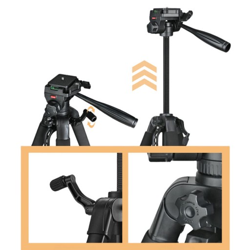 Dwie poziomice umożliwiają precyzyjne ustawienie pionu, a pokrętło w rączce uchwytu oraz pokrętła boczne pozwalają zwolnić lub zablokować możliwość ruchów głowicą statywu. Sama głowica umożliwia również robienie ujęć w pionie.