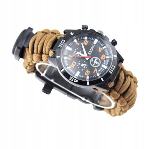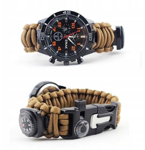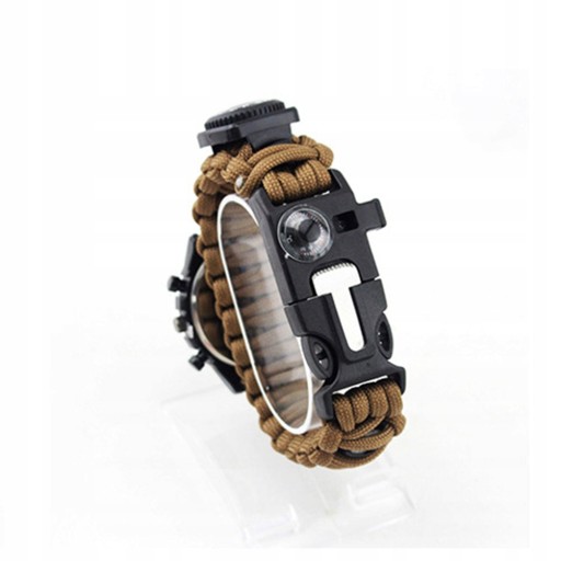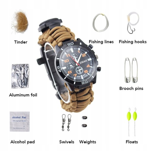 Ten przedmiot to nie tylko zwykły zegarek typu paracord, ale także wielofunkcyjny zewnętrzny sprzęt ratunkowy z kompasem, termometrem, skrobaczką do startu ognia, funkcjami paracordu. Zestaw zawiera gwizdek ratunkowy, akcesoria wędkarskie, wkładkę alkoholową, hubkę i folię aluminiową bezpieczeństwo na zewnątrz i przetrwanie. Pasek przyjmuje wysokiej jakości ciężki paracord 7-żyłowy klasy wojskowej, który może wytrzymać ciężar 330 funtów / 150 kg, pasek można rozłożyć na 3,5-metrowe przyczepy linowe i, w razie potrzeby, pierwszej pomocy. Idealne narzędzia do przetrwania biwakowanie na zewnątrz i wojskowe, wspinaczka, turystyka, polowanie, speleologia, nocna jazda, sport i inne zajęcia na świeżym powietrzu.