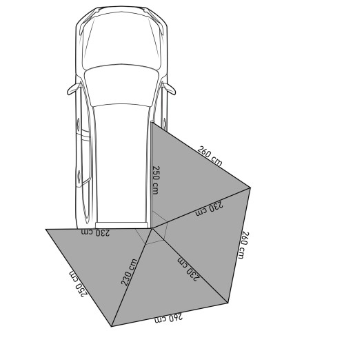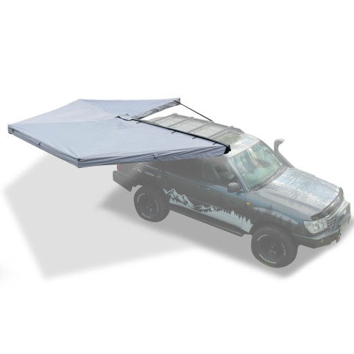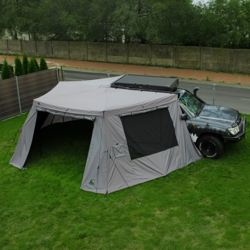 Kluczowym atutem zadaszenia Wild Camp BATWING II PREMIUM jest jego imponująca rozpiętość ramion, które obejmują 270 stopni wokół pojazdu.