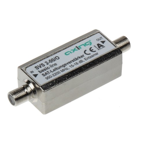 Liniowy wzmacniacz satelitarny firmy Axing. Pracuje w paśmie 950-2200MHz. Przepuszcza zasilanie oraz sygnał 22kHz. Jego wzmocnienie to 20dB. Stałe wzmocnienie powoduje podniesienie sygnału w całym paśmie.