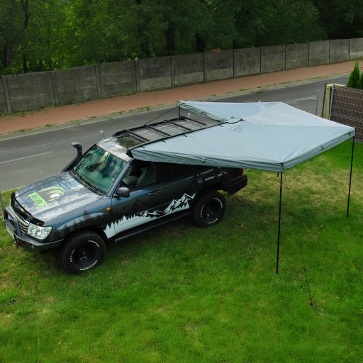 Konstrukcja markizy opiera się na wytrzymałych profilach aluminiowych, które są jednocześnie lekkie i trwałe. Dzięki swojej innowacyjnej konstrukcji i dużej rozpiętości ramion, markiza ta znacząco zwiększa funkcjonalność przestrzeni wokół samochodu