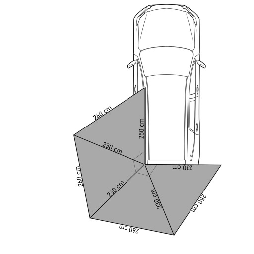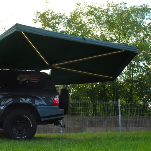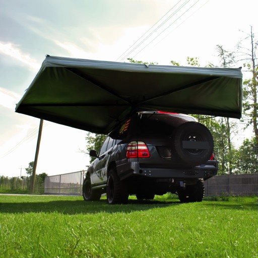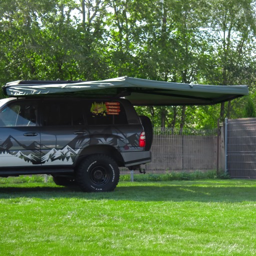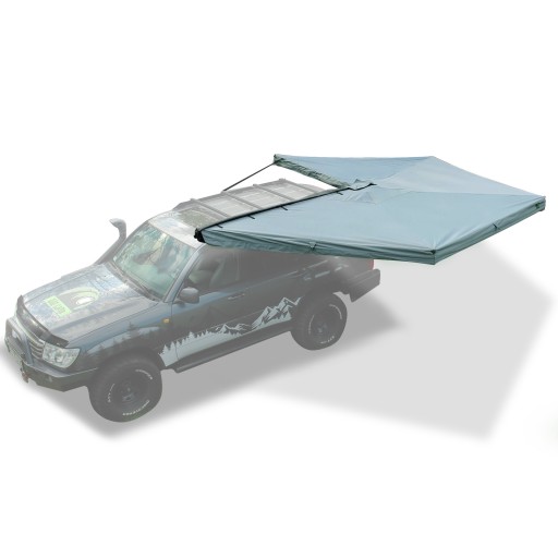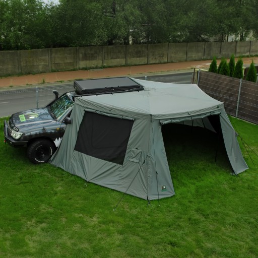 Kluczowym atutem zadaszenia Wild Camp BATWING II PREMIUM jest jego imponująca rozpiętość ramion, które obejmują 270 stopni wokół pojazdu.