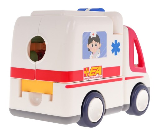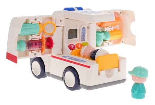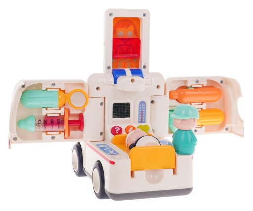 Interaktywna edukacyjna karetka ambulans z efektami świetlnymi i dźwiękowymi oraz akcesoriami medycznymi to propozycja dla dzieci od 3-go roku życia. Karetka jeździ sama i zmienia kierunki jazdy po napotkaniu przeszkody. Wydaje przy tym liczne dźwięki takie jak syreny pogotowia, klaksonu i rozruchu silnika, hamowania, odgłosy bicia serca pacjenta, oraz wesołe melodie. Efekty dźwiękowe można wyciszyć lub wyłączać gdy zajdzie taka potrzeba. Ambulans posiada otwierane drzwi boczne, oraz dach. Po otwarciu mamy dostęp do pacjenta i narzędzi medycznych. Kierowca oraz instrumenty medyczne są wyjmowane i mogą być używane jako oddzielne elementy. Zabawka zasilana jest bateriami typu 3 x AA 1,5V. Zabawka może działać w dwóch trybach.