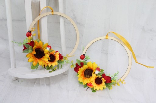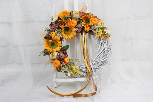 Jesienny, delikatny i uroczy wianek wiklinowy o średnicy 20cm (z dekoracją około 25cm) udekorowany jesiennymi kwiatami słonecznika i astrów.