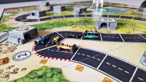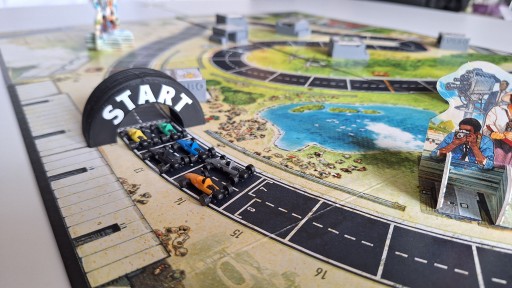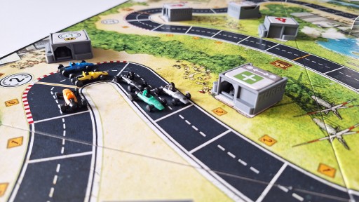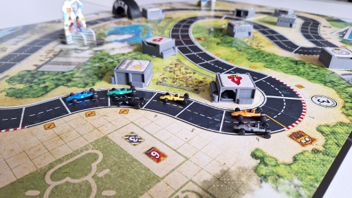 W skład zestawu wchodzą garaże z miejscem na żetony plus punkt startowy