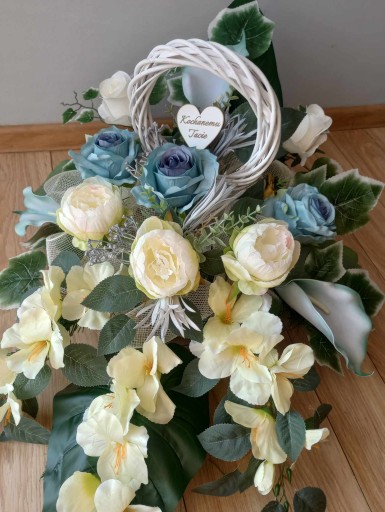 Przepiękny kwiaty na grób ze sztucznych kwiatów, kompozycja Z KOŁEM WIKLINOWYM na płytę z możliwością wybrania dedykacji dla babci/dziadka/mamy/taty (wszystkie dostępne opcje są widoczne na ostatnim zdjęciu). Nasze kompozycje wykonujemy własnoręcznie ze starannością, dzięki czemu stroiki są niepowtarzalne, a na żywo prezentują się jeszcze piękniej :)