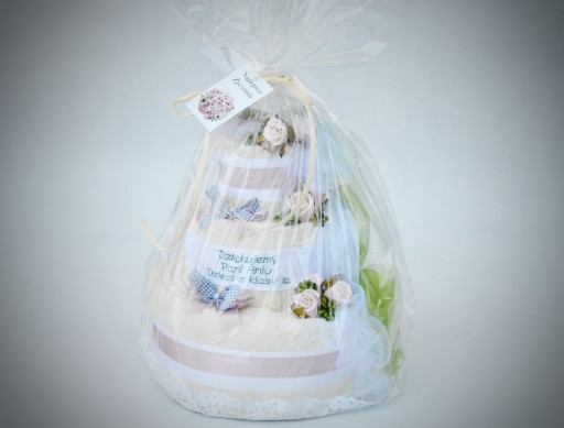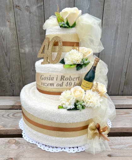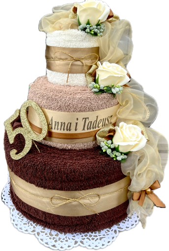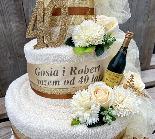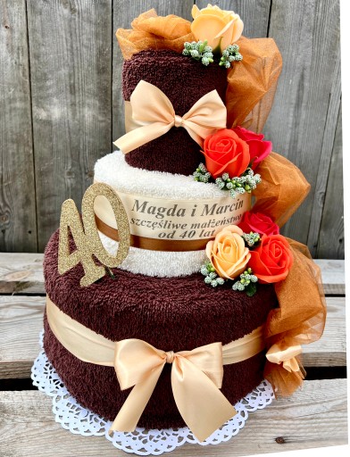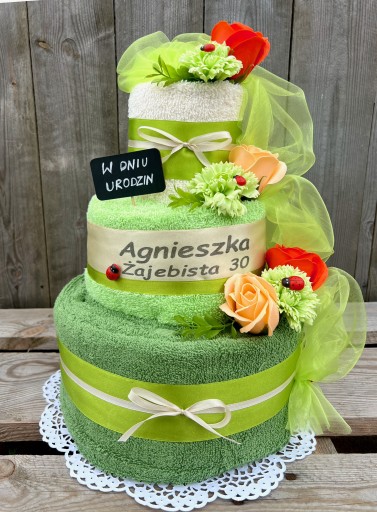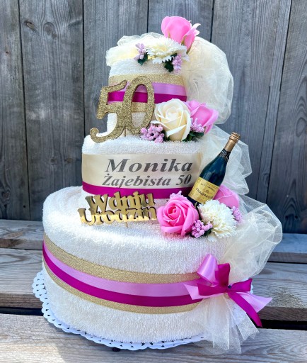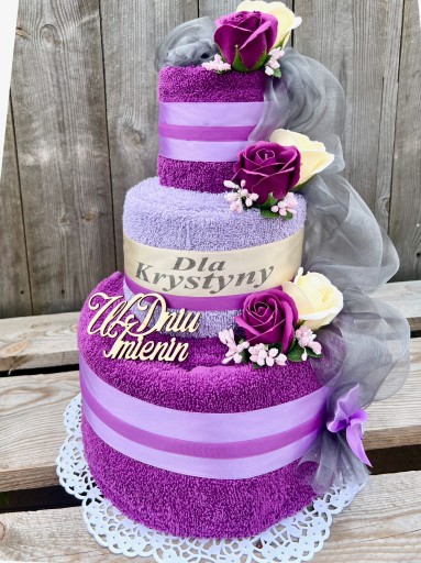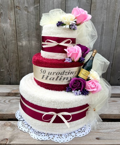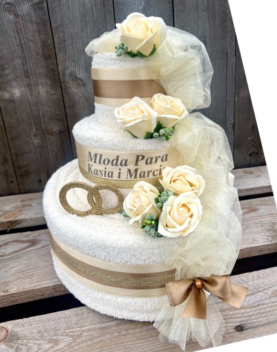 Tort z ręczników ozdobiony mydlanymi kwiatami z personalizowaną dedykacją na wstążce to NAJLEPSZY PREZENT na każdą okazję. Doskonały prezent na ślub, rocznicę ślubu, podziękowania, imieniny czy urodziny. Zaskocz wszystkich niepowtarzalnym podarunkiem.