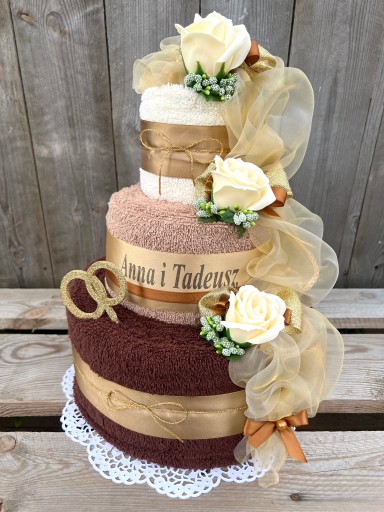 Prezent na Rocznicę Ślubu Tort z 4 Grubych Ręczników Kwiaty Róże Mydlane