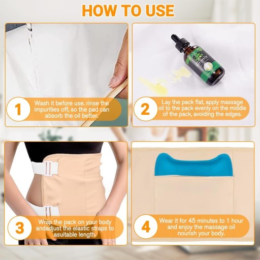 Przed pierwszym użyciem zaleca się umycie opakowania. Umieść 1-2 miarki bio-oleju rycynowego na środku opakowania i zawiąż je wygodnie wokół talii. Noś przez 45 minut do 1 godziny, aby cieszyć się odżywczym masażem.