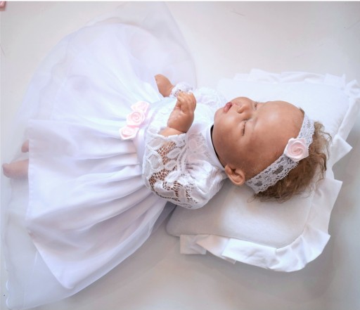PIĘKNY BAWEŁNIANY KOMPLET DO CHRZTU SUKIENKA I OPASKA KORONKOWA