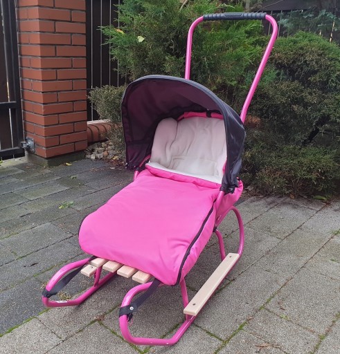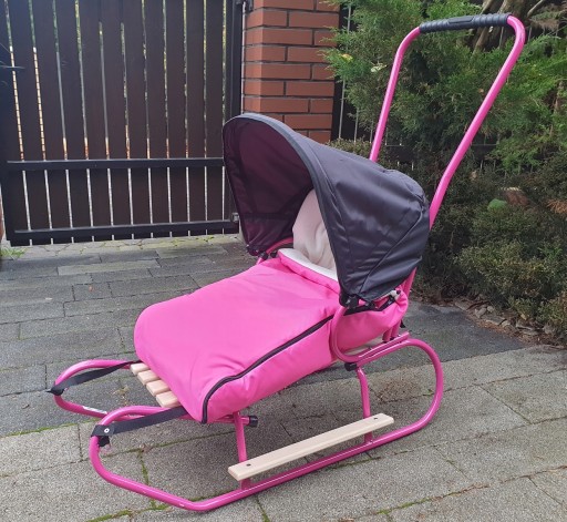 OTRZYMUJĄ PAŃSTWO CAŁY KOMPLET, CZYLI SANKI Z WYSOKIM OPARCIEM, PCHACZEM I PODNÓŻKAMI , BUDKĘ ORAZ GRUBY ŚPIWOREK W WYBRANYM KOLORZE