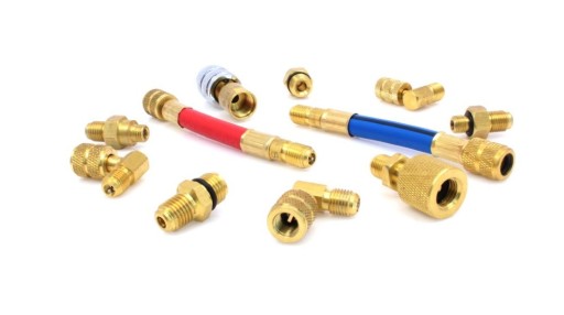Komplet adapterów, redukcji i wężyków do obsługi układów klimatyzacji wykorzystujących czynnik chłodniczy R134A lub R12.