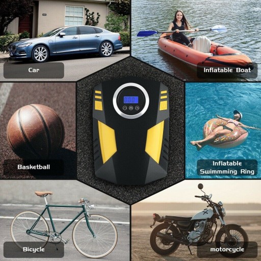 Safe and Durable: The movement of our small inflator comes with brass coarse coil that makes it safe, quick, powerful and durable. Muti-Functional: Heavy duty for cars, bicycles,motorcycle, bike or balls with different nozzle adaptors; With the LED emergency light, you will not be afraid of darkness any more. Specification: Material: Plastic ABS Working voltage: DC 12V Maximum Current: 10 A Max air pressure: 150PSI Power Cord Length: 2.85M Hose Length: 40cm Flow rate: 35 L/Min Weight: 0.79 KG Continuous Working Time: 10 Mins Product Dimensions:20.5x15x7 cm Instructions for use: Insert the air nozzle on the rubber tube head directly on the tire valve. When you hear the sound of air leaking from the tire, it means that the air has circulated. Continue to tighten the air nozzle. At this time, the air will no longer escape. Insert into the DC12V cigarette lighter When inflating, the indicator of the instrument rises with the saturation of the tire. When the pointer reaches the appropriate tire pressure (the tire pressure of a general car tire is 223kpa=35PSI), remove the plug and the air nozzle to complete the work. Please use the professional ball needle and plastic nozzle equipped with the machine to connect with the gas nozzle to inflate the ball and other gas-consuming equipment.