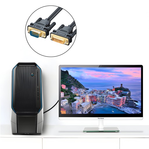 Łatwy w użyciu kabel umożliwiający połączenie urządzenia z portem DVI-I z monitorem z portem VGA, zapewniający pełną rozdzielczość 1080P Full HD. To proste rozwiązanie gwarantuje szybkie i skuteczne połączenie, umożliwiając korzystanie z wysokiej jakości obrazu na monitorze bez zbędnych komplikacji w obsłudze.