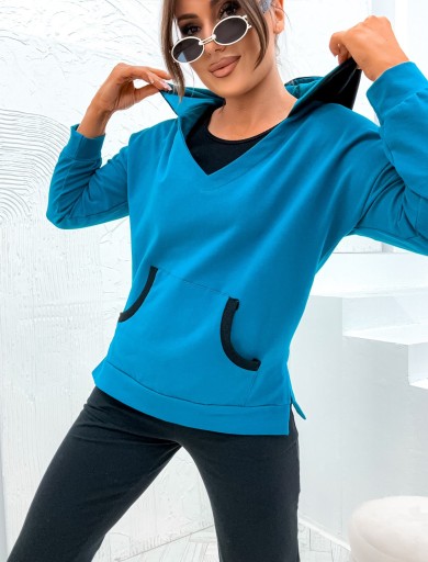 - Bluza z kapturem. Wkładana przez głowę. Dekolt V. Z przodu kieszeń typu kangurek.