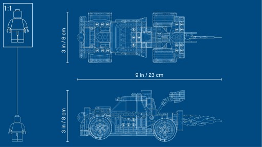- Modele są szczegółowe i stworzone do akcji. Samochód rakietowy ma ok. 8 cm wysokości, 22 cm długości i 7 cm szerokości — co oznacza, że tę świetną zabawkę można zabrać ze sobą wszędzie, a równocześnie jest ona wystarczająco duża, by w środku zmieściła się minifigurka (której nie ma w zestawie).