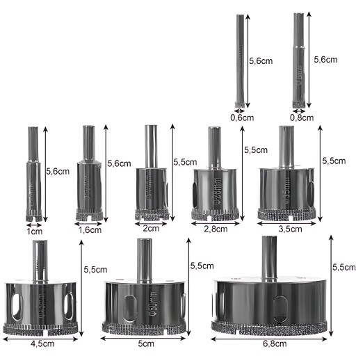 ZESTAW 10 OTWORNIC DIAMENTOWYCH 6, 8, 10, 16, 20, 28, 35, 45, 50 i 68 mm DO GRESU, SZKŁA, PŁYTEK itp.