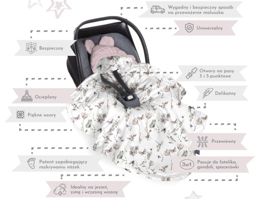 ☆ Kocyk ma uniwersalny rozmiar. Pasuje do fotelików i wózków z pasami 3 i 5 punktowymi.