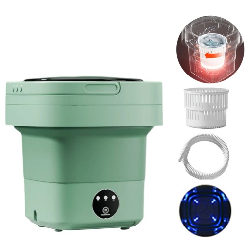 -Ta zminiaturyzowana pralka została specjalnie zaprojektowana tak, aby można ją było złożyć do małej walizki i łatwo transportować. Kiedy chcesz zrobić pranie, po prostu rozłóż pralkę i włóż ubrania do środka.