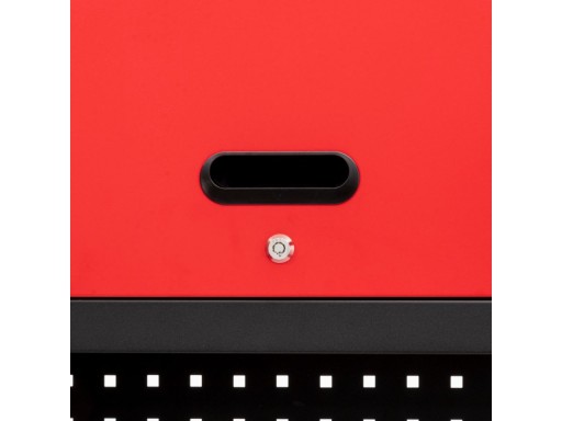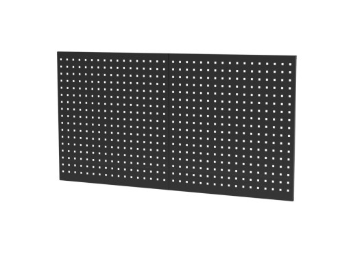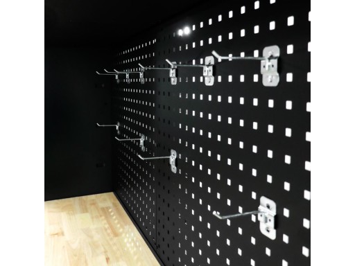 Tylna ściana składa się z dwóch płyt ściennych. Na płytach można zawiesić 10 haczyków dołączonych do zestawu, które doskonale sprawdzą się do zawieszania narzędzi pneumatycznych i kluczy. Wygodne rozwiązanie, gdy chcesz mieć wszystko pod ręką. W zestawie dołączone są dwie płyty.