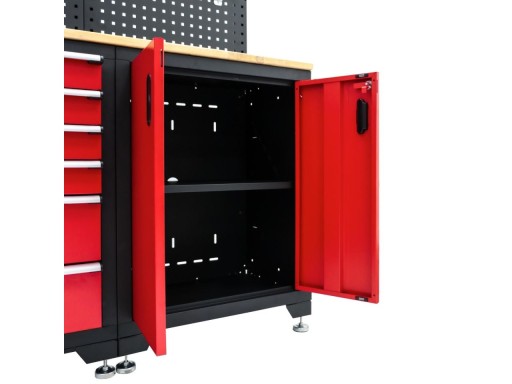 Dzięki temu modułowemu zestawowi wyposażenia warsztatu masz kompletny mebel warsztatowy. W skład zestawu wchodzi duża szafka boczna z otwieranymi drzwiczkami, dolna szafka z sześcioma szufladami np. na narzędzia, dwie górne szafki, mała szafka oraz tylna ściana, na której dodatkowo można zawiesić dowolne narzędzia na haczykach. Szafka modułowa ma wymiary 198,3 x 51 x 192,5 cm . Dla ochrony blat brzozowy pokryty jest lakierem lnianym i ma wymiary 132 x 44.