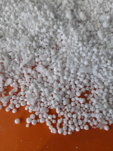 Przedmiotem aukcji jest 200 litrów regranulatu z domieszką styroduru xps - kulek o regularnych i nieregularnych kształtach.