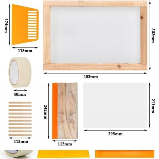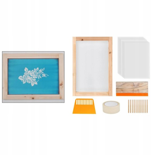 PAKIET ZAWIERA: W tym 1 sztuka 1575x1181 Cal drewnianych ramek do sitodruku z 110 białą siatką 1 sztuka ściągaczki do sitodruku 1 sztuka plastikowego skrobaka 10 sztuk folii do drukarek atramentowych 1 sztuka rolki maski 10-częściowy drewniany patyczek