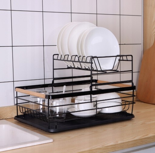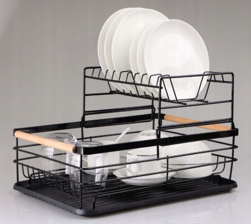 Suszarka do naczyń charakteryzuje się bardzo wysoką jakość i trwałą i metalową konstrukcją. Wykonana z żywicy tacka chroni blat przed zamoczeniem. W zestawie znajduje się również plastikowy, dwukomorowy ociekacz na sztućce. Metalowa czarna suszarka z drewnianymi rączkami jest eleganckim rozwiązaniem do każdej kuchni.