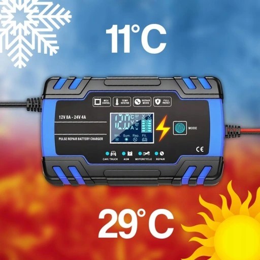 W zależności od wykrytej temperatury na ekranie podświetli się adekwatna ikonka i prostownik optymalnie naładuje podłączony pojazd/urządzenie.