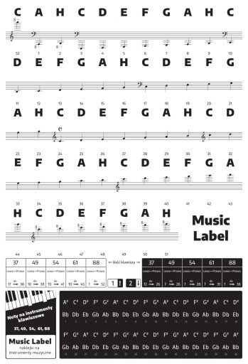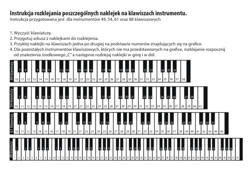- Naklejki przystosowane dla instrumentów 37, 44, 49, 54, 61, 76 oraz 88 klawiszowych.