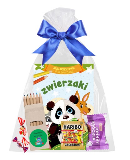 Wszystko zapakowane w woreczek prezentowy i przewiązane kolorową kokardką
